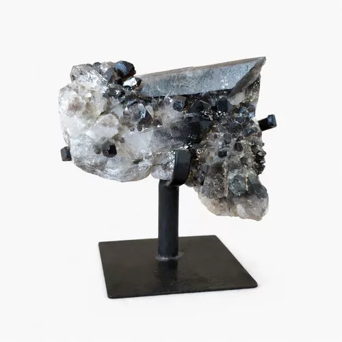 Ce quartz fumé monté sur support dévoile une structure cristalline brute aux teintes profondes et nuancées, mêlant transparence et reflets fumés. Avec ses 21 cm de largeur et 19 cm de hauteur, il s’impose comme une pièce unique et puissante.