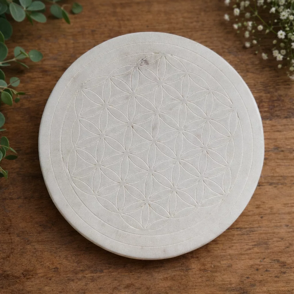 Cette fleur de vie est finement gravée sur du marbre blanc naturel. Symbole de géométrie sacrée, elle est idéale pour dynamiser vos boissons, recharger vos minéraux ou apporter une énergie harmonisante à votre espace.