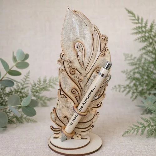Apportez une note poétique à votre espace de travail avec ce porte-stylo en bois de peuplier, finement découpé et délicatement orné d’une dorure à la cire. Son design inspiré d’une plume élégante en fait un objet à la fois décoratif et fonctionnel, idéal pour sublimer votre bureau.